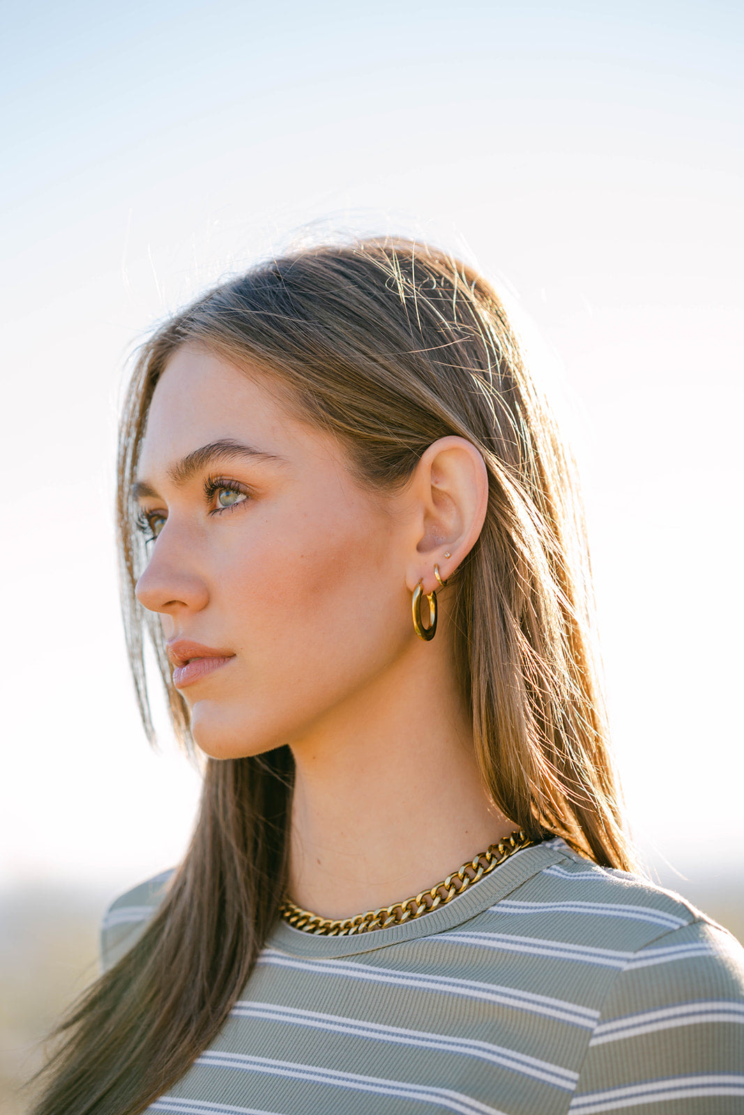 Timeless doesn't have to mean plain. Our pieces are meant to stack or can stand alone. Stacking necklaces is an easy way to make a statement showcasing classic designs in a new light. Here, we pair The Hedy chain with the clasp in front, The Marilyn Herringbone, and The Grace Elongated Chain for a fun statement.