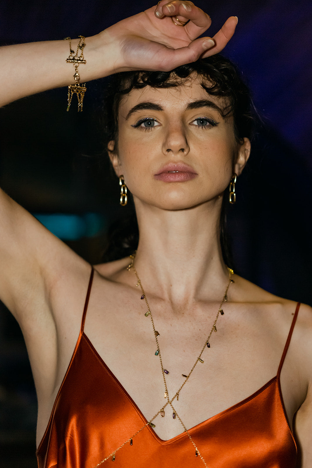 Timeless doesn't have to mean plain. Our pieces are meant to stack or can stand alone. Stacking necklaces is an easy way to make a statement showcasing classic designs in a new light. Here, we pair The Hedy chain with the clasp in front, The Marilyn Herringbone, and The Grace Elongated Chain for a fun statement.