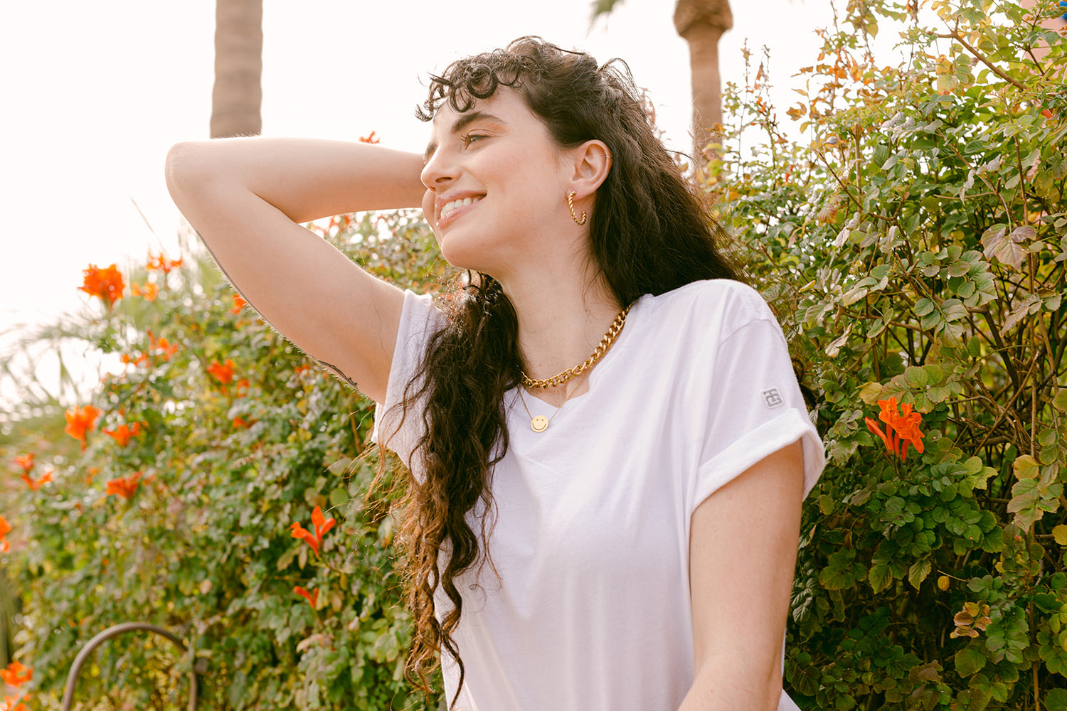 Timeless doesn't have to mean plain. Our pieces are meant to stack or can stand alone. Stacking necklaces is an easy way to make a statement showcasing classic designs in a new light. Here, we pair The Hedy chain with the clasp in front, The Marilyn Herringbone, and The Grace Elongated Chain for a fun statement.