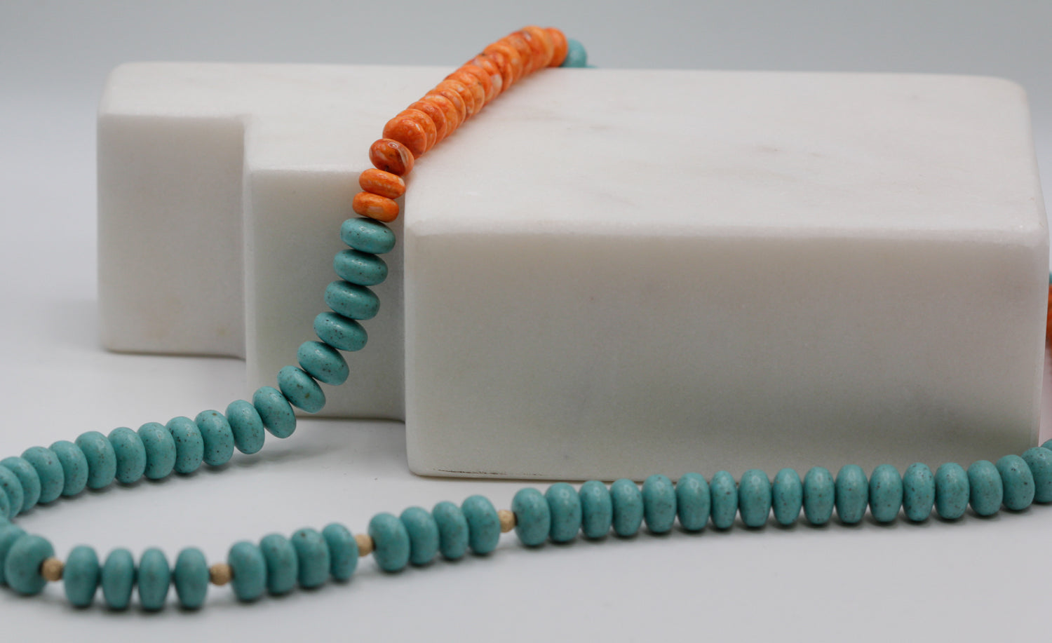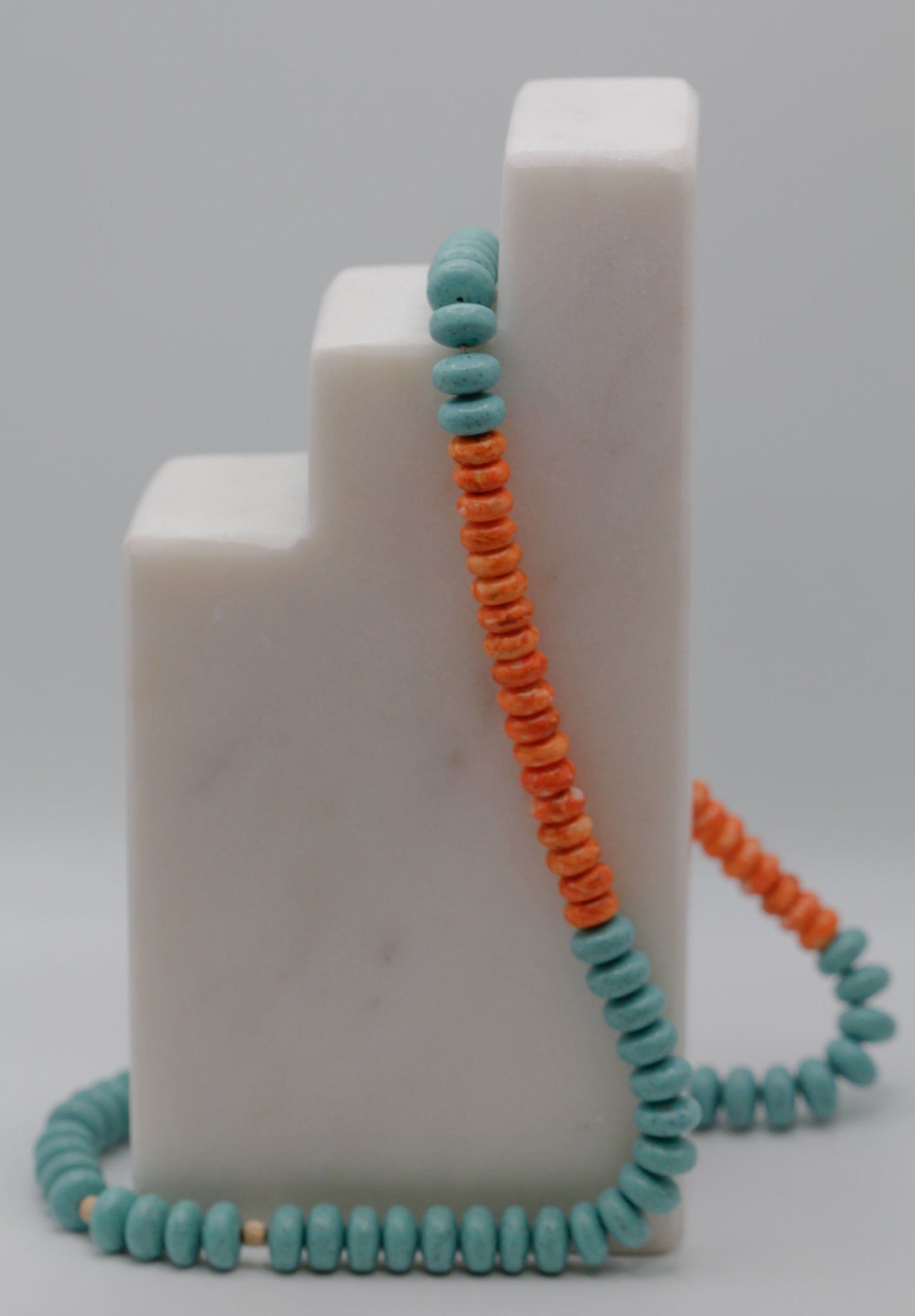 The Candace Necklace was inspired by the sunset over the ocean. Made with 8mm Turquoise rondelle beads, Orange spiny oyster rondelle beads, and 14k gold filled beads, with a sterling silver lobster clasp closure.