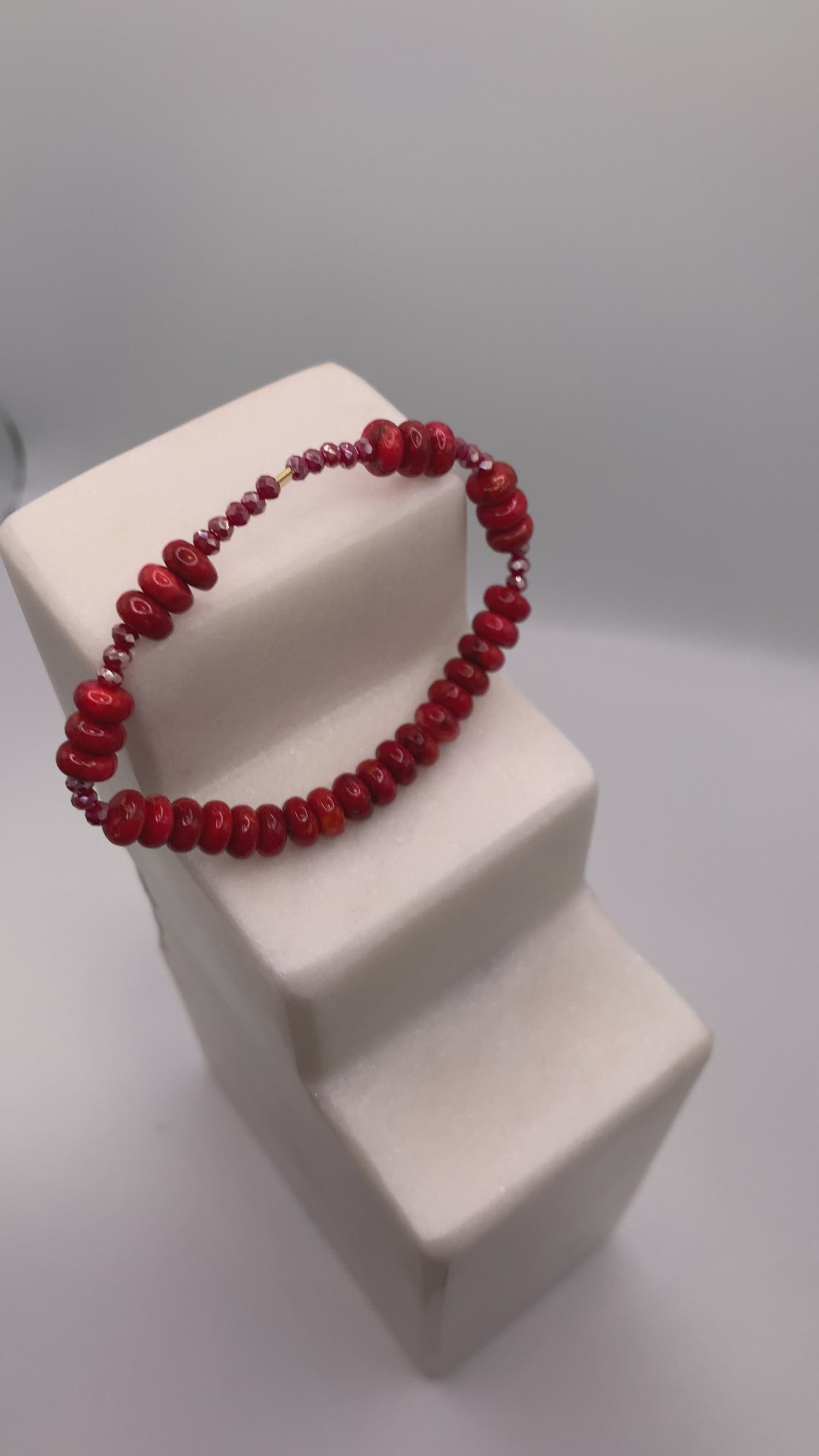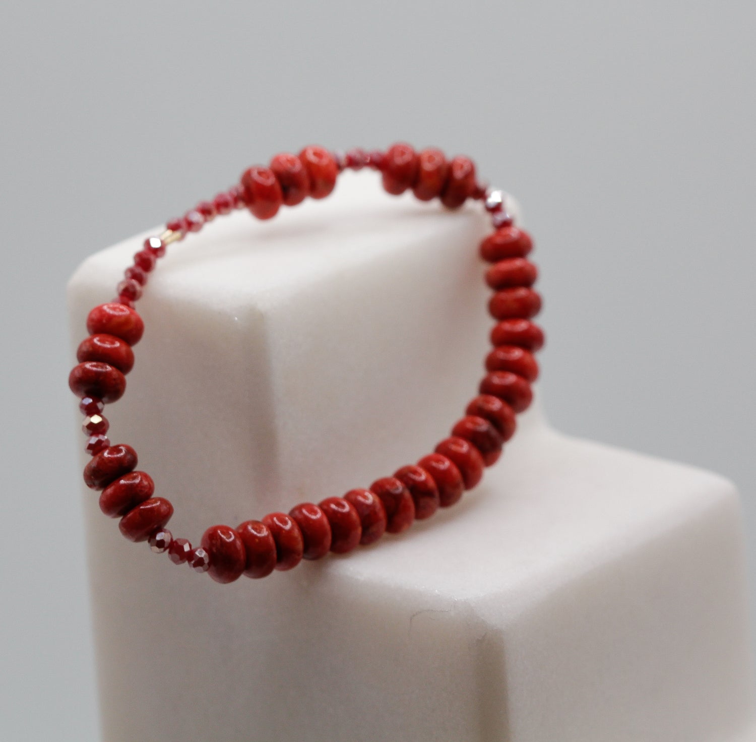Danielle is a non traditional tribute to the mystical red Kabbalah bracelet, meant to enlighten and remind us to be kind to each other and ourselves. Wearing the red string is also a protector against the evil eye and negative energy that may distract us from our true purpose. These hand carved rondelle beads are made from Bamboo Coral(6mm). The largest grouping is made of 18 beads for good luck.