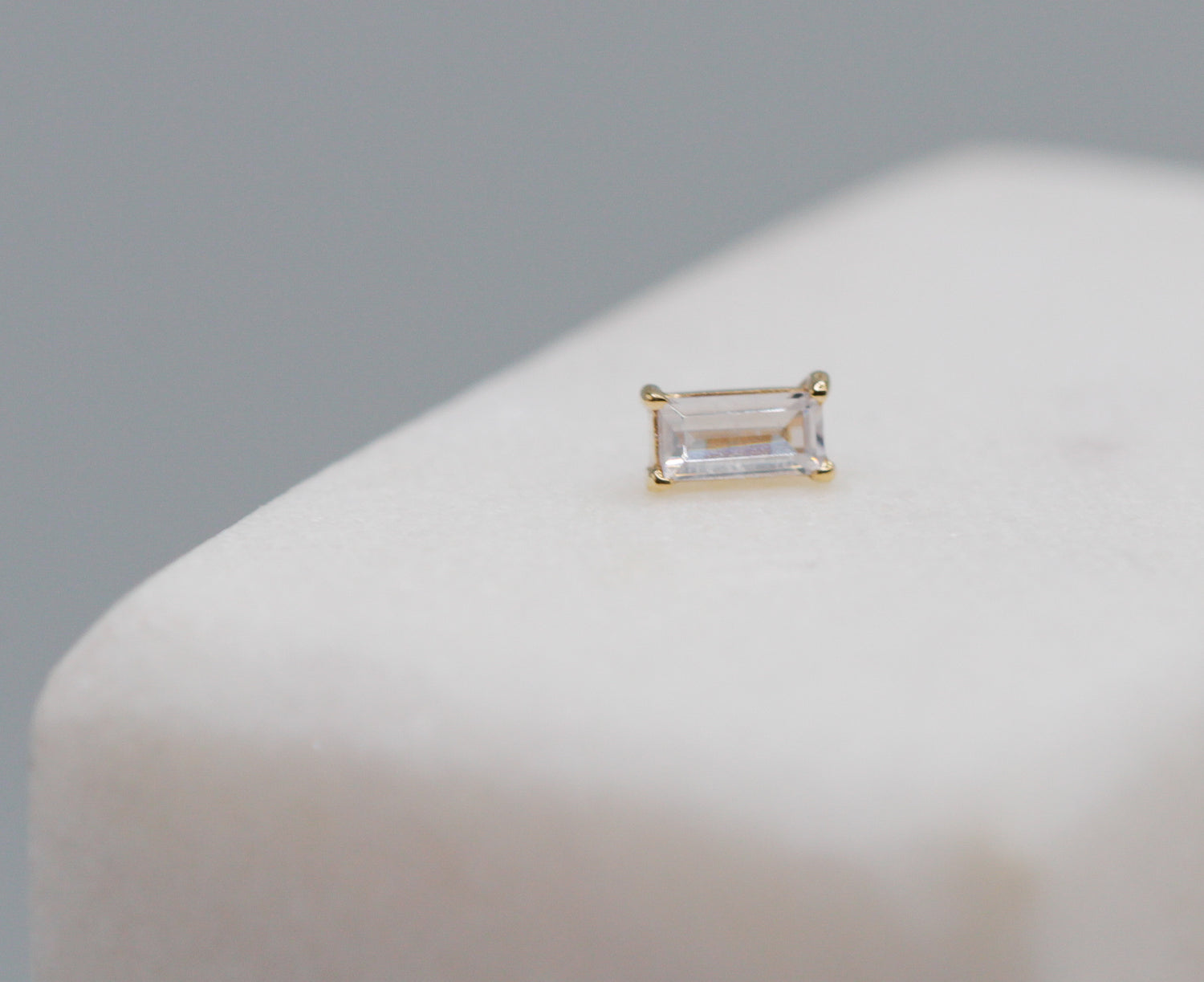 Regal, fame, special. Just a few words that come to mind when designing this mini emerald cut 14K gold push pin earring. Emma is simply fabulous.