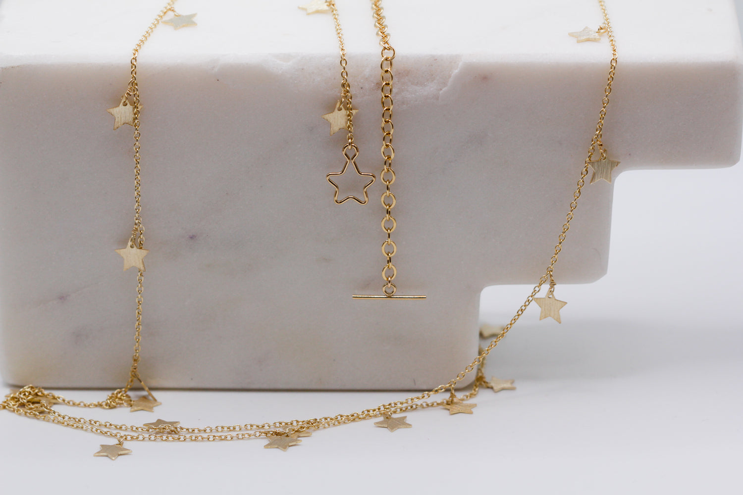 Shoot for the moon and land among the stars in the Estrella body chain. This chain hugs you in the right places and the delicately placed stars create a galactic statement for any occasion where you want to feel like a star. 14k Gold Vermeil.