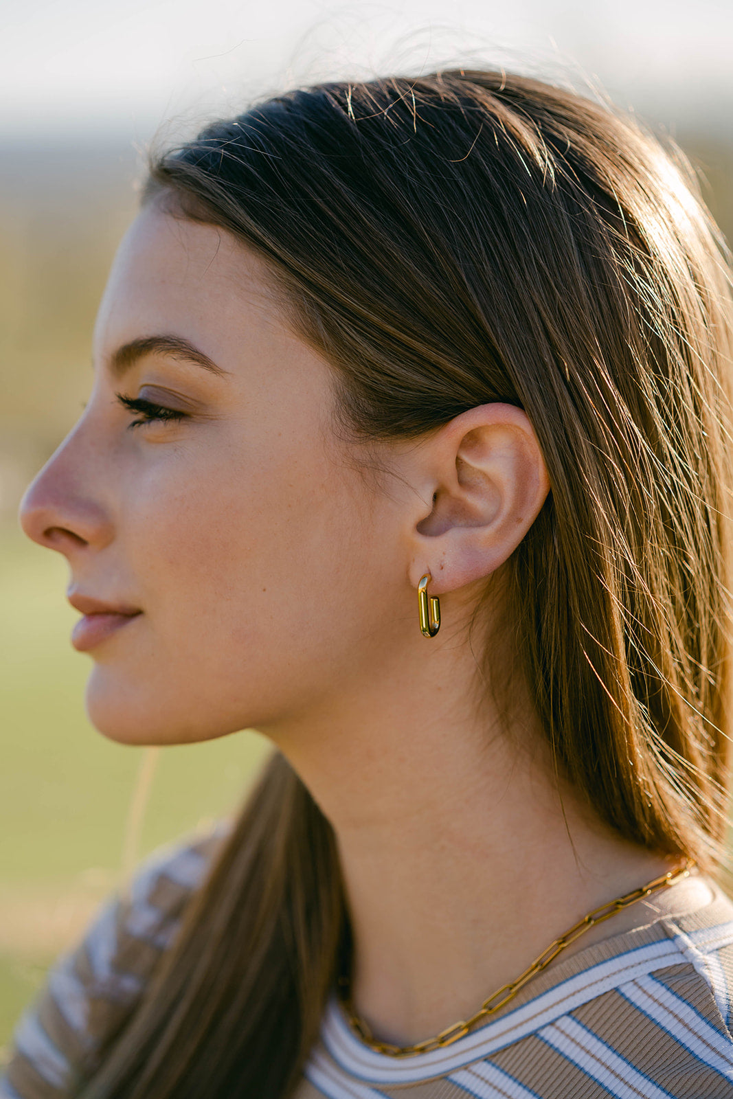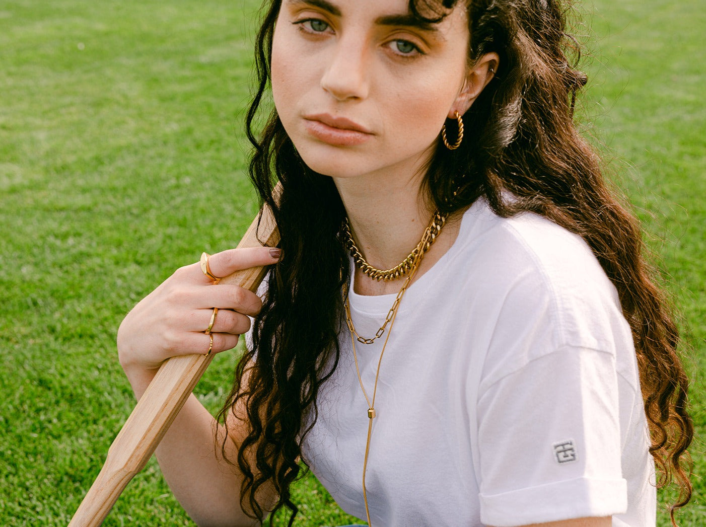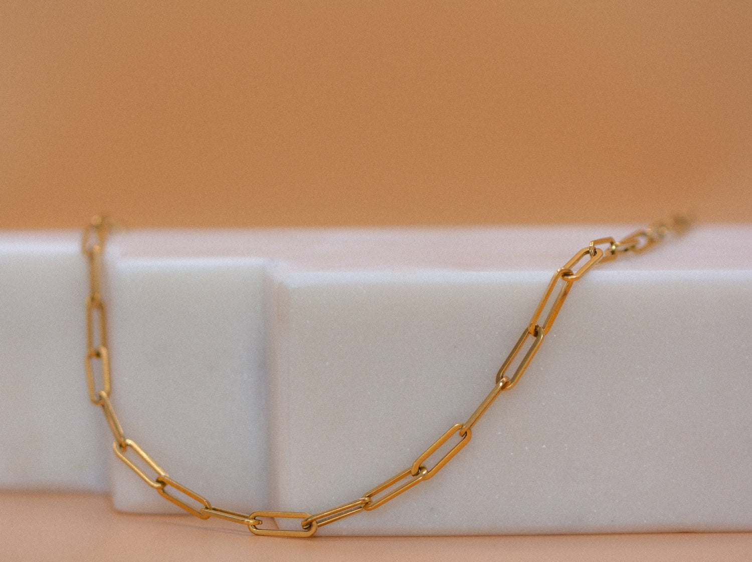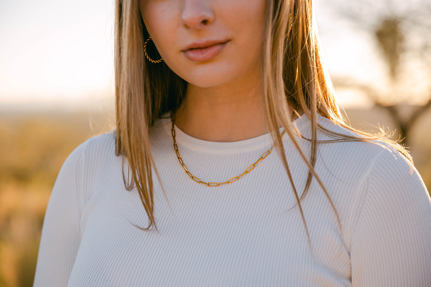 Timeless doesn't have to mean plain. Our pieces are meant to stack or can stand alone. Stacking necklaces is an easy way to make a statement showcasing classic designs in a new light. Here, we pair The Hedy chain with the clasp in front, The Marilyn Herringbone, and The Grace Elongated Chain for a fun statement.