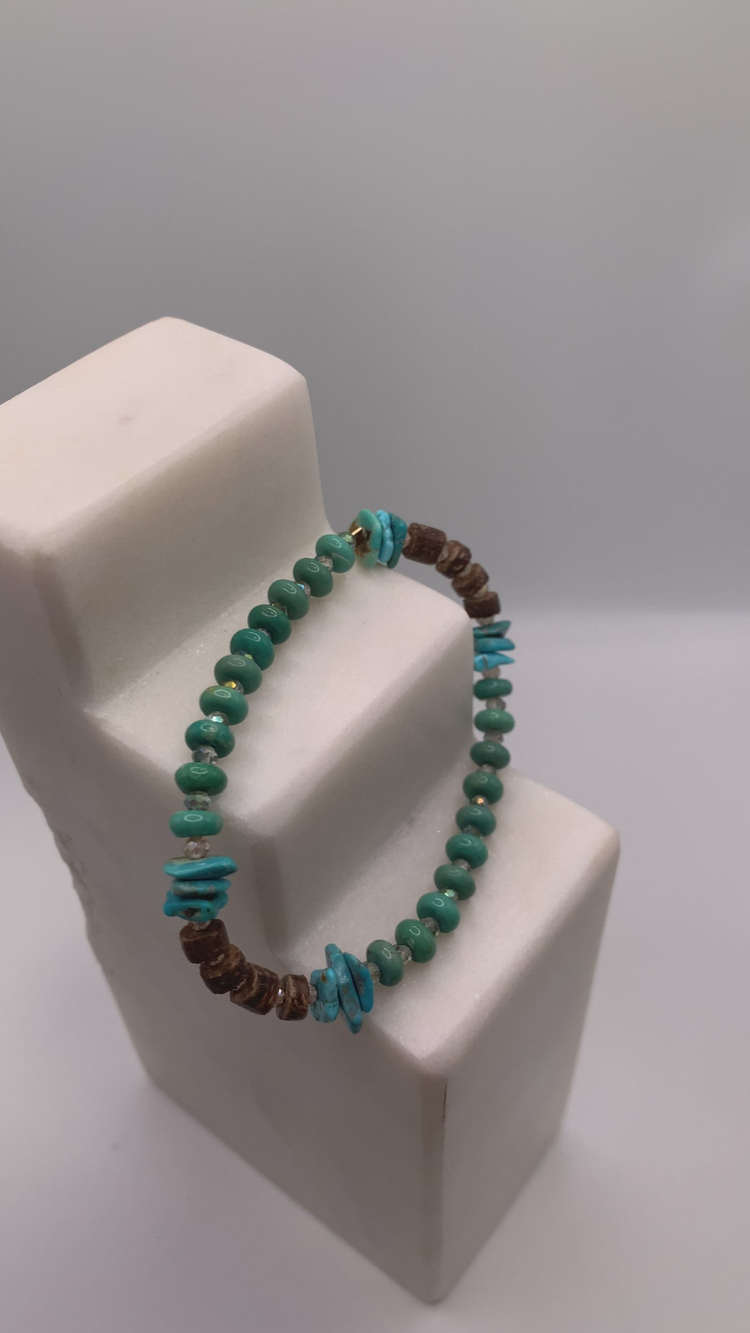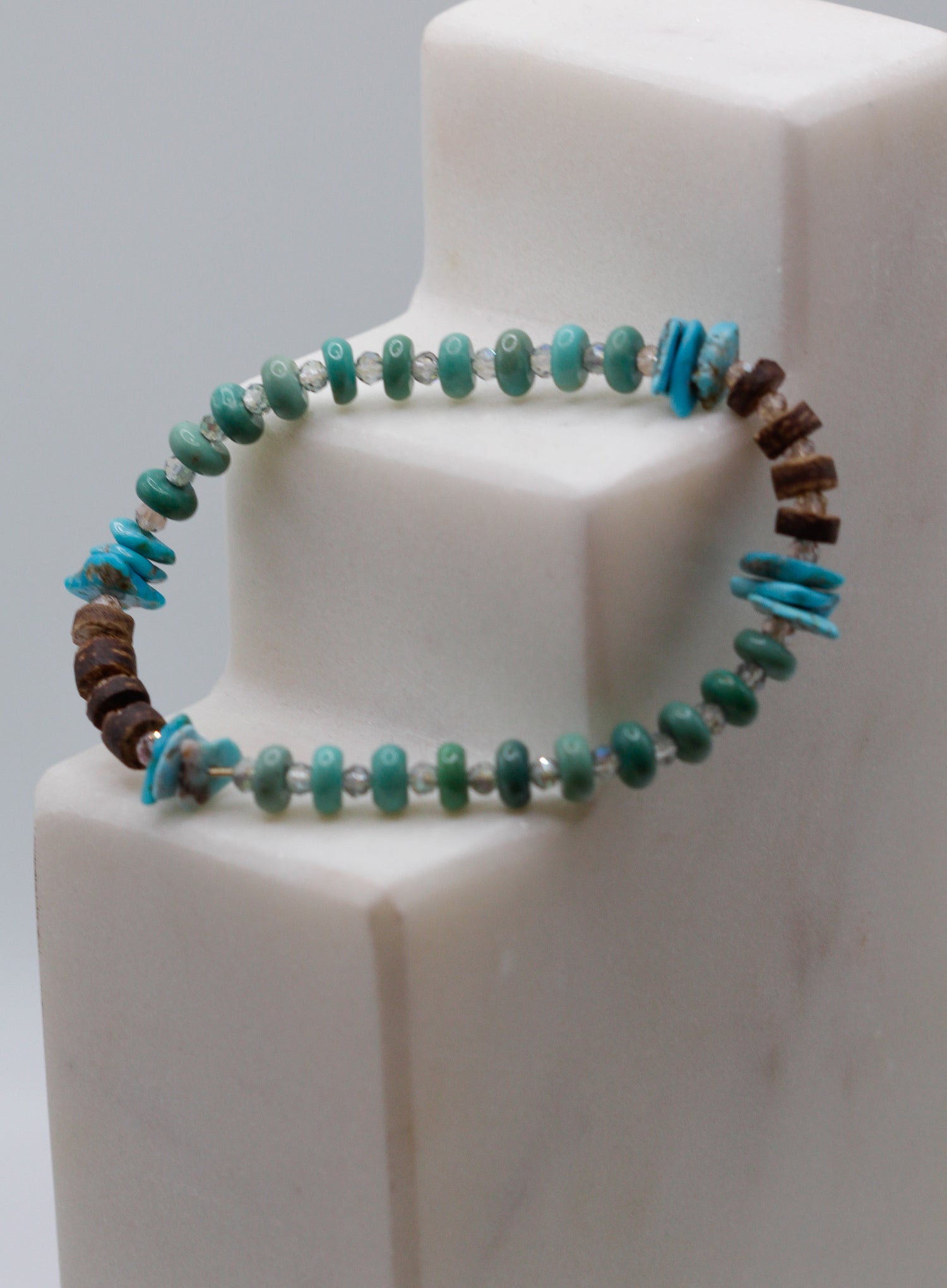 Samantha is an oceanic inspired bracelet symbolizing the beautiful connection of the land and sea. Represented by hand crafted 6mm rondelle green Turquoise beads, angular Turquoise, and a natural heishi Coconut bead. The colors are rich like the elements they represent. Transcend back to the beach at high tide, and let the calm block out the chaos of daily life.